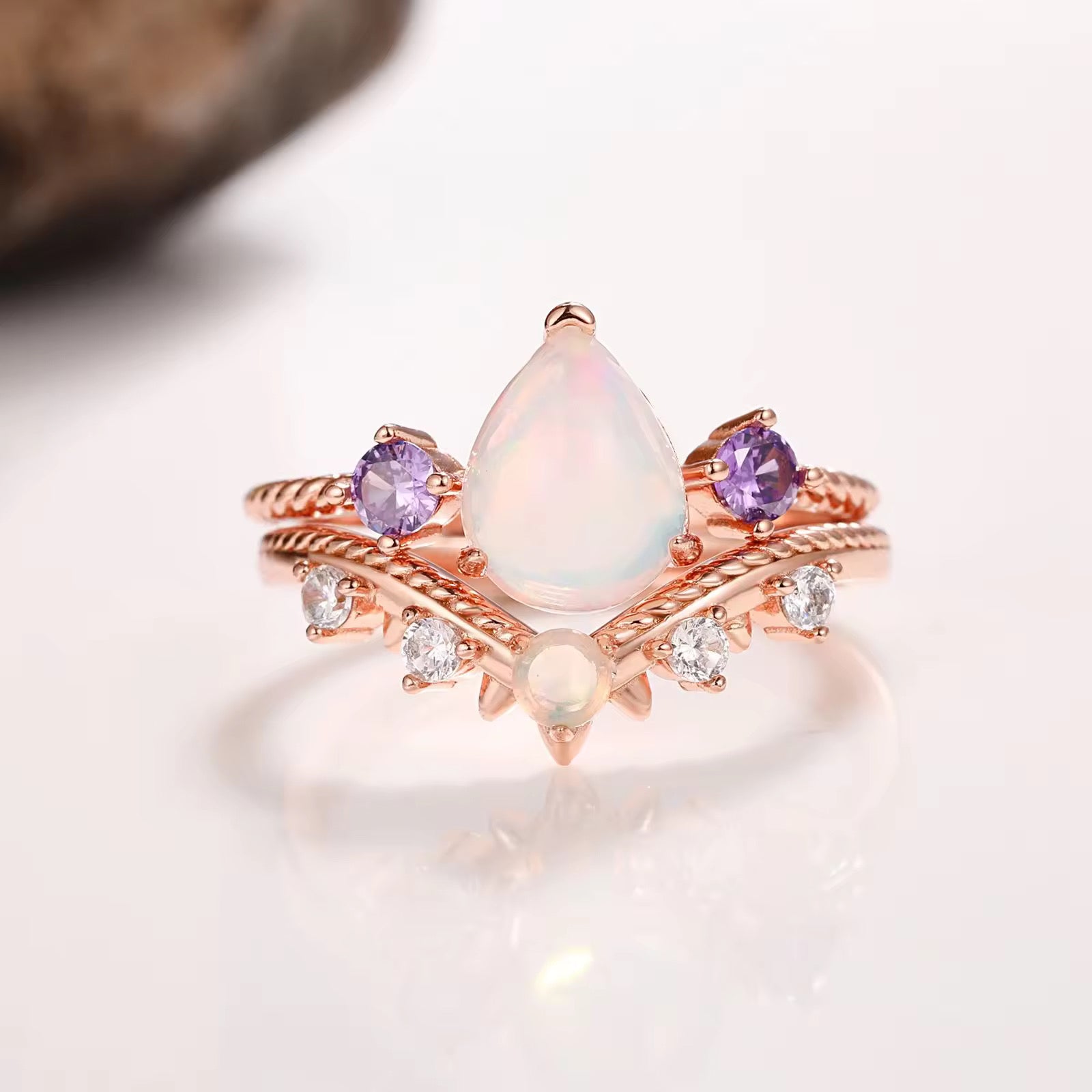 April Natural Opal and Amethyst Ring Set Rose Gold