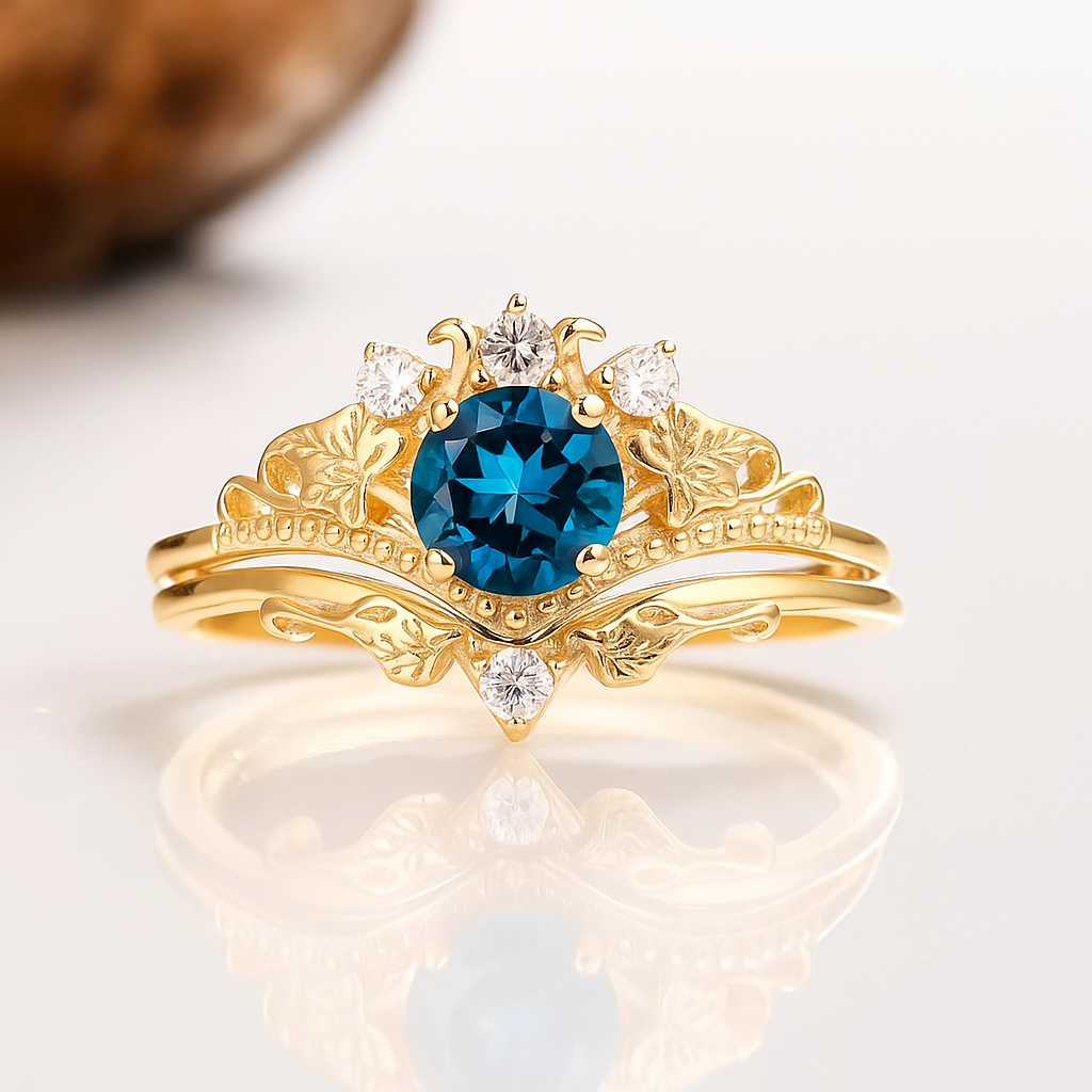 The Ashla London Blue Topaz Ring Set features a stunning blue topaz gemstone, set in a luxurious gold vermeil band. The rich, deep blue color of the topaz is enhanced by the natural quartz diamonds surrounding it, creating a striking and elegant design.