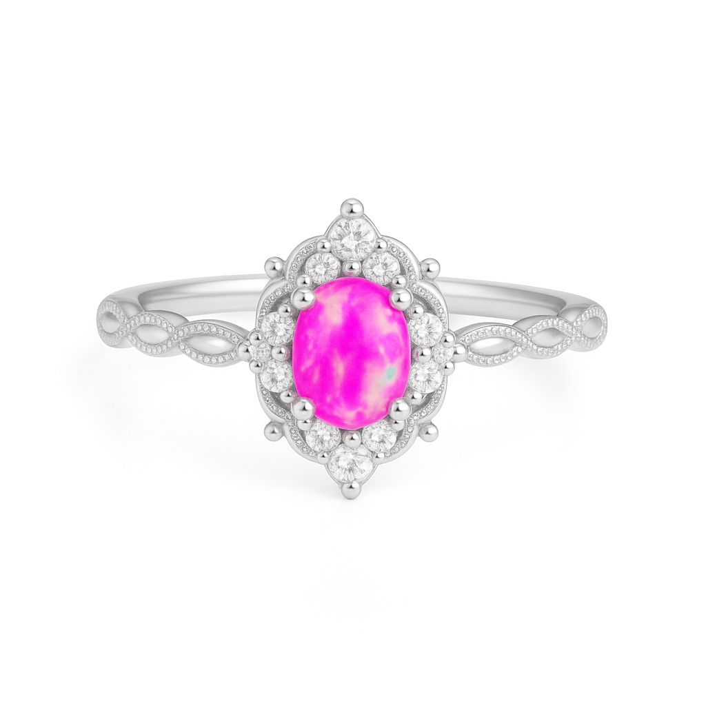 - Bright pink opal, vibrant centerpiece with shifting hues and natural character.