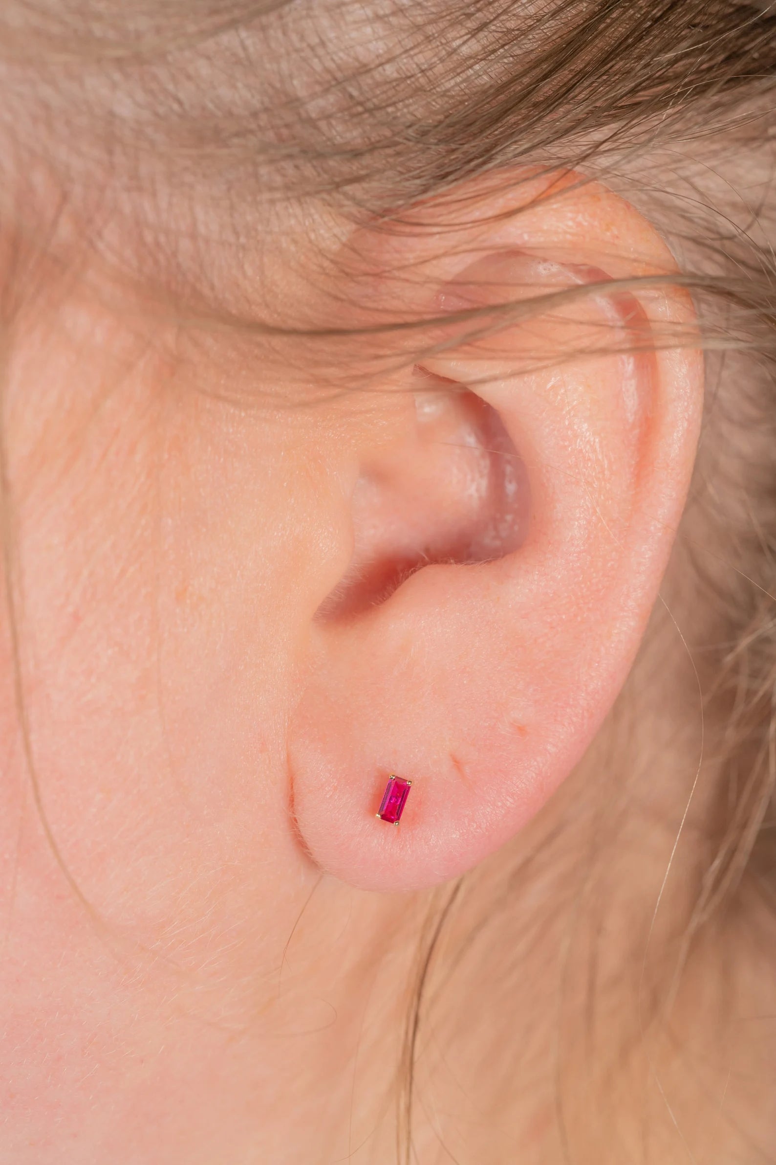 The Pia Ruby Earrings take a minimalist approach to luxury, with 1.7 x 4mm rubies set in solid 14k gold or rose gold.