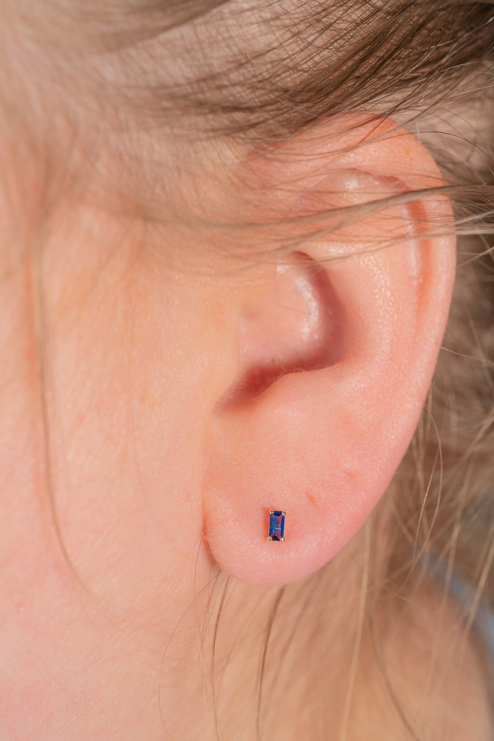 Crafted from 14k solid gold or rose gold, these petite 1.7x4mm studs feature deep blue sapphires that bring a quiet pop of color to any look.