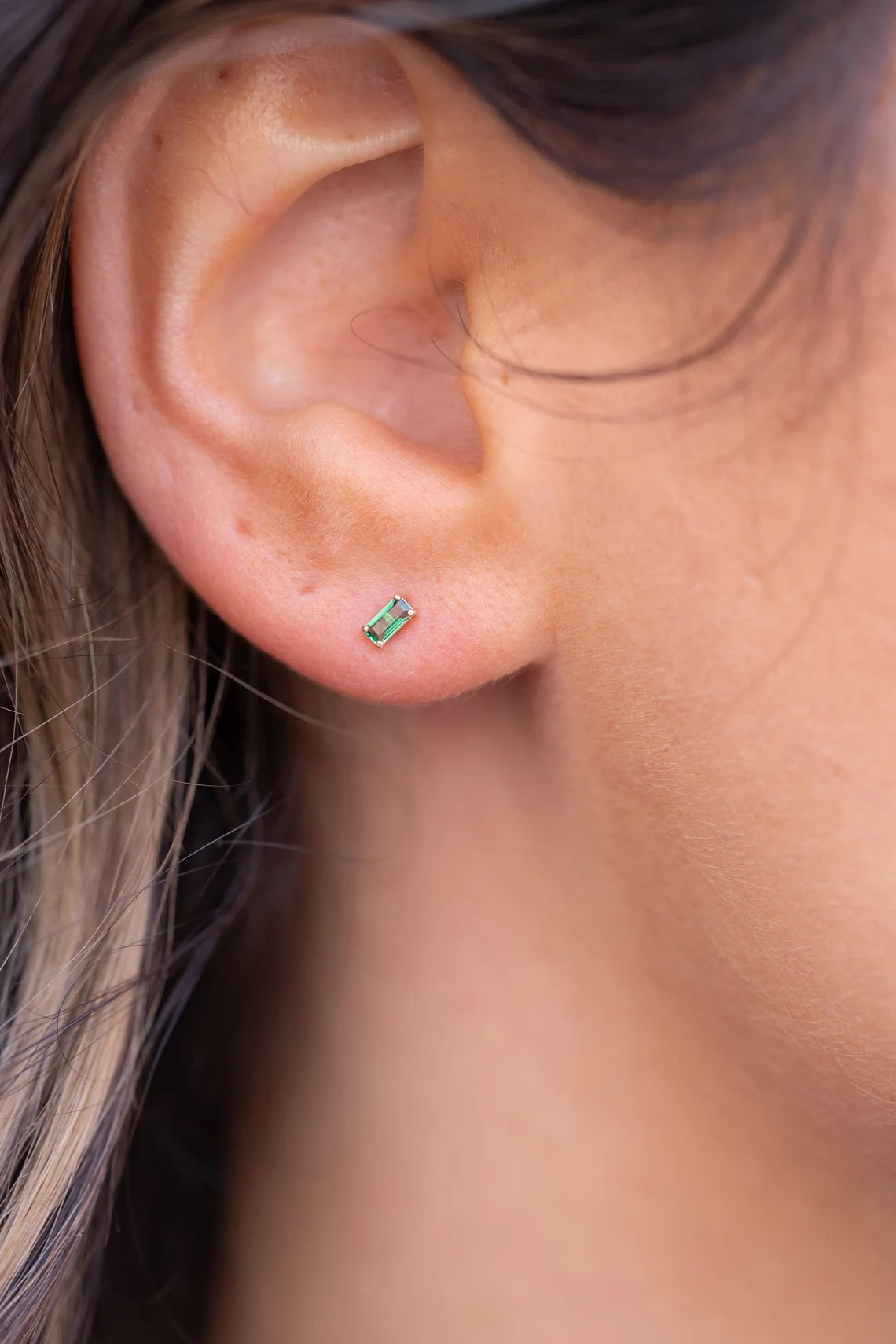 The Pia Emerald Earrings feature delicate 1.7 x 4mm emerald gemstones set in solid 14k gold or rose gold.