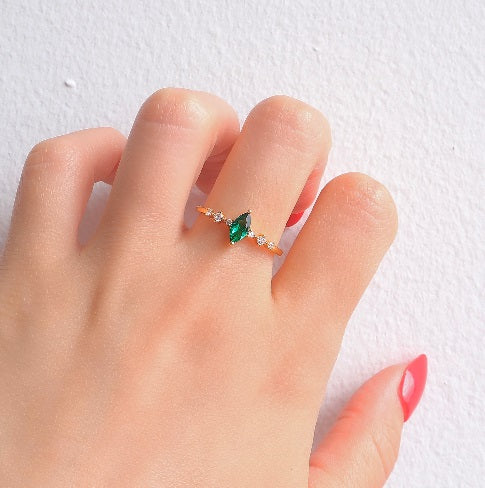 The Ava Alexandrite Ring holds a 0.75-carat natural alexandrite, a gemstone that changes between deep green and violet depending on the light.
