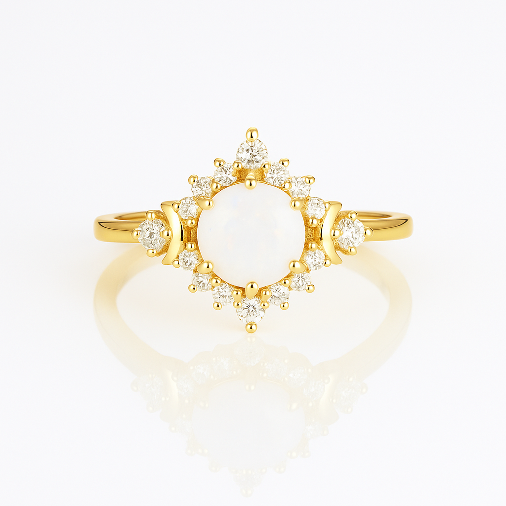 At the center is a natural opal with soft colors that change with every move—shades of blue, pink, and gold that feel calm and fresh without being flashy.