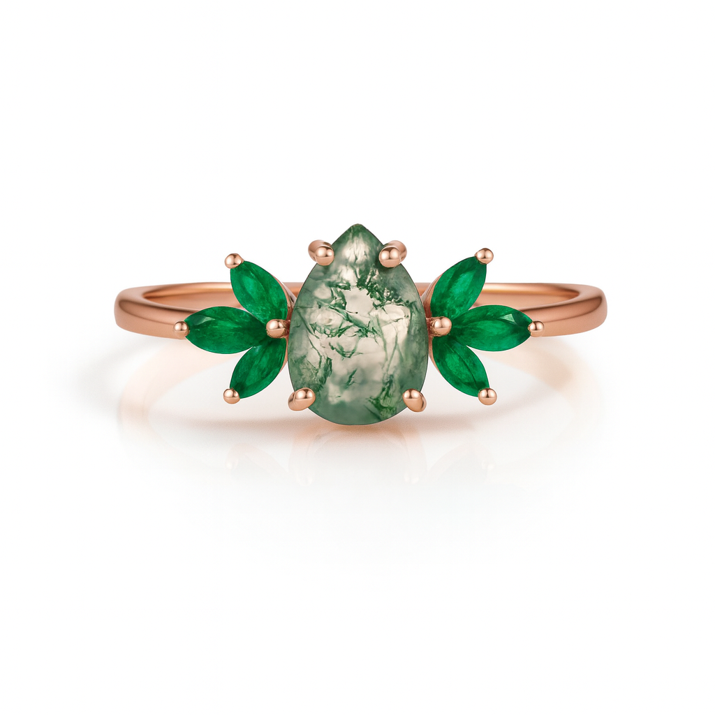 Add timeless elegance to your collection with the Ivy Moss Agate Ring, crafted in luxurious rose gold. This exquisite ring features a stunning 1.0-carat moss agate quartz centerpiece surrounded by six emerald accents, blending sophistication with a natural charm.