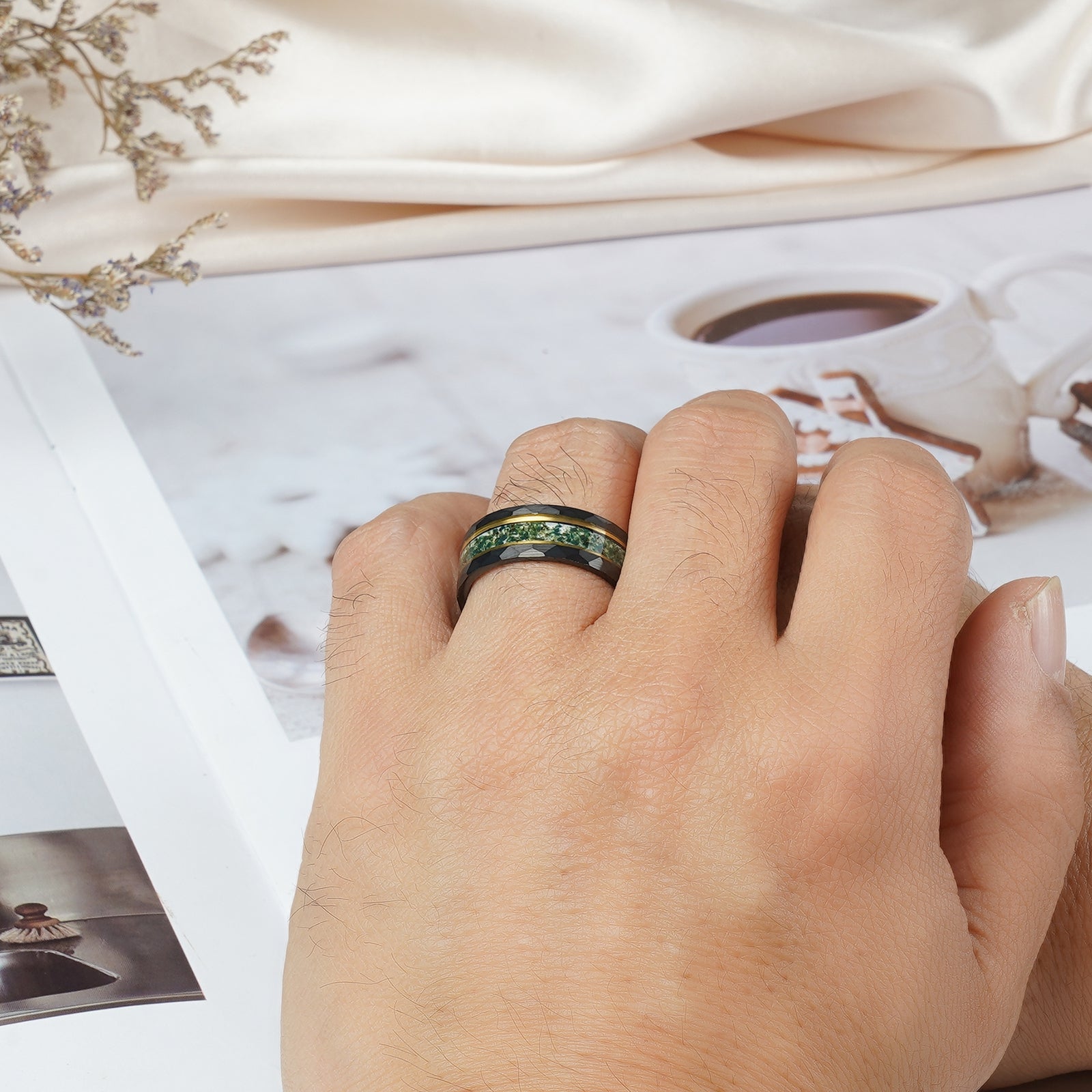 - Tungsten Carbide band with an earthy green moss agate inlay